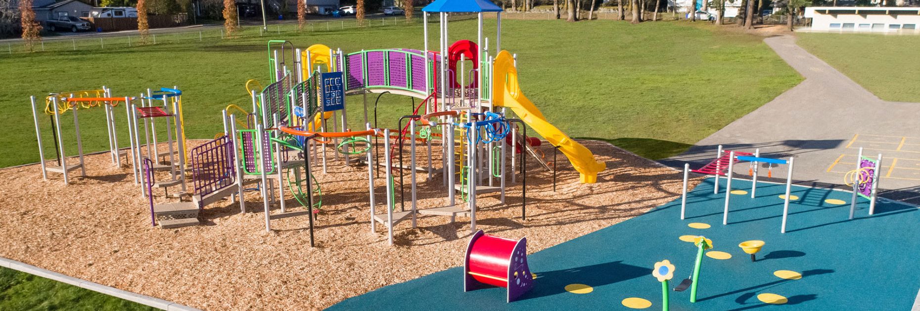 With its bright colours and distinct play zones, this multi-faceted playground creates a kaleidoscope of play and delivers fun for diverse abilities and ages at Lake Hill Elementary School in Victoria, B.C. The vibrant play structure is packed with elevated climbing, hanging and sliding activities while the accessible play zone supplies a variety of interactive panels along wih upper-body, spinning and rocking activities at ground level. Two types of safety surfacing help create a more inclusive, yet economical playground.