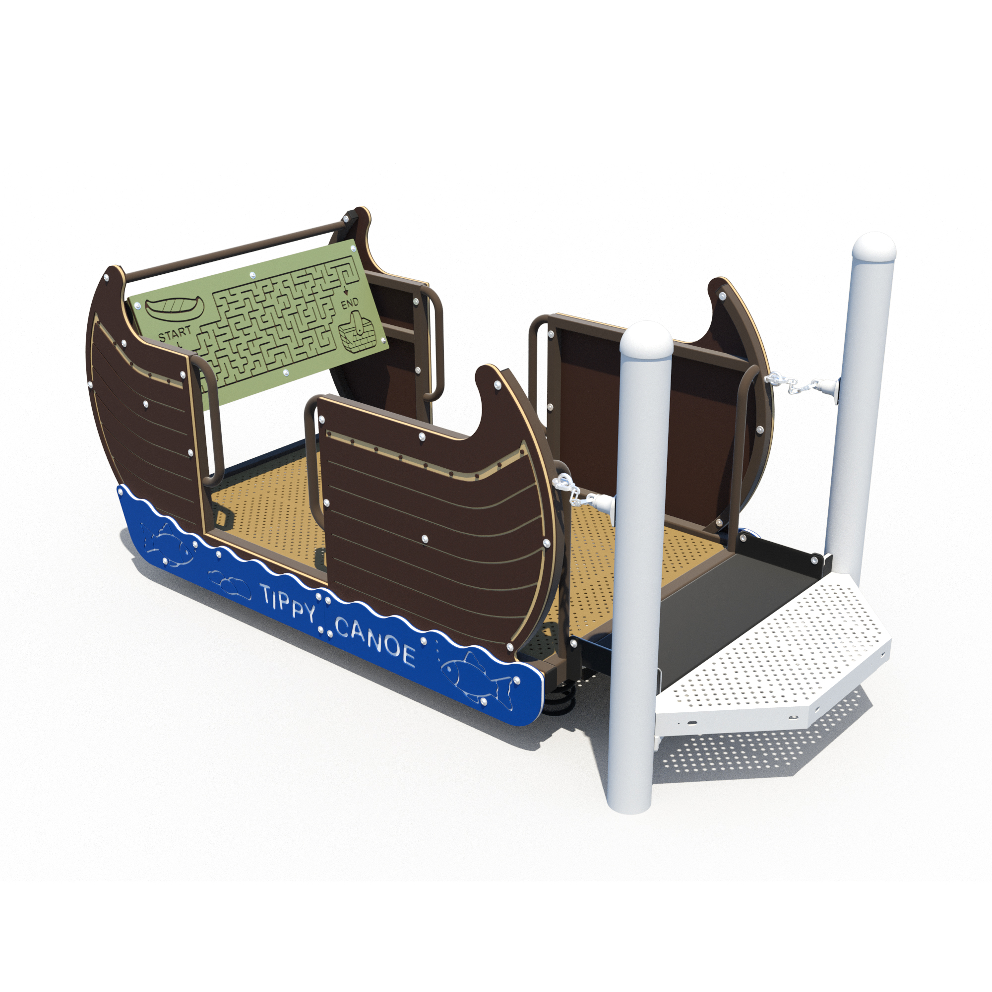 The Accessible Tippy Canoe is a wheelchair-accessible playground component designed for multi-ability, multi-age and multi-user fun. Mounted on ginat springs for a fun bouncing and rocking experience, it attaches directly to a playground deck and easily integrates with modular structures. Users with wheelchairs and other mobility aids can roll on independently and enjoy the motion alongside friends, creating a truly inclusive play experience. A maze at the front of the canoe serves as a fun finger puzzle, adding play value.