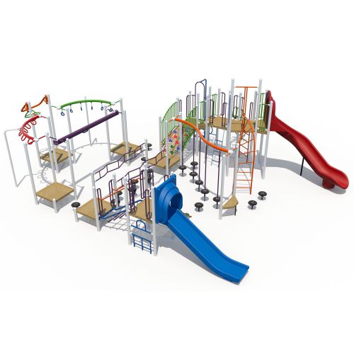 Young Canadians of all abilities will enjoy playing on the All-Canadian accessible playground structure. A wheelchair ramp leads to a spacious hex deck and on to the spring-mounted Tippy Canoe where multiple users can bounce over the waves together. Various climbers and slides round out the fun on this Canada-themed design.