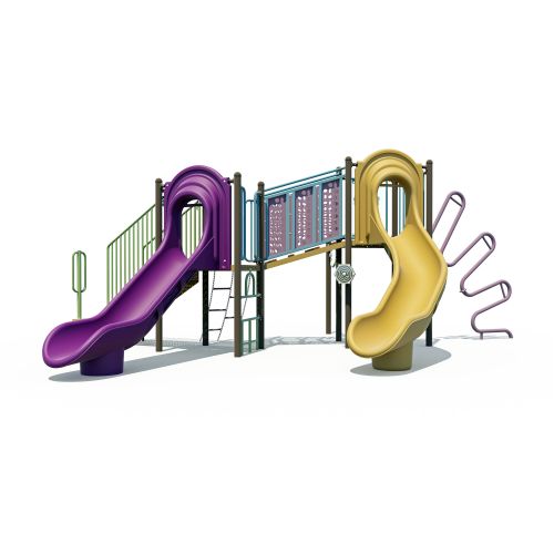 The space-saving Butterfly Grove playground packs height, insect-themed activities and play value into a small footprint. Kids will enjoy the huge boulder climber as well as the insect memory game. Stunning leaf roofs and butterfly post-toppers top off the fun.
