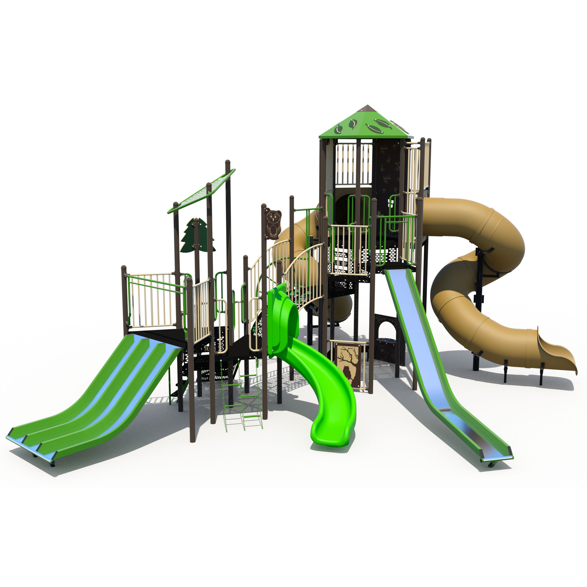 The Calmar tower playground features an impressive height of 109″ with side-by-side Twisty Tube Slides! Multiple slides of different heights help create fun for all ages and stages.