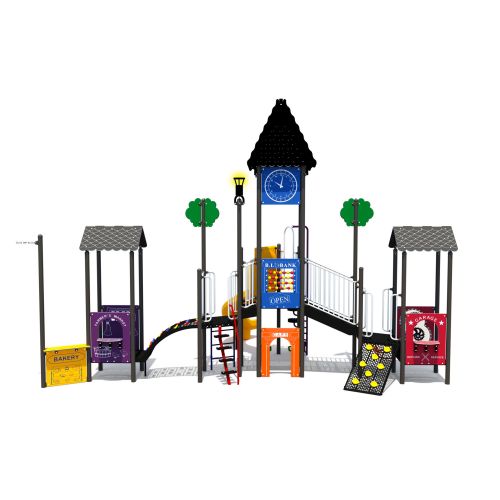 From the towers and turrets to castle windows and archways, the Castle Park playground is all about playing pretend. Children of all ages can imagine they are kings and queens ruling the land. A wide assortment of slides, climbers and overheads create an action-packed playground for all ages. This castle is even home to a big dragon that lets kids climb and hang all over it!