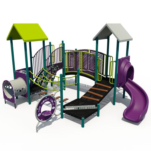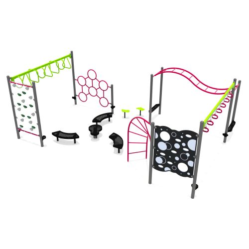 The Escapade playground checks all the boxes that school-aged kids love the most. Features an extensive overhead circuit for upper body action along with multiple climbers and slides. Steel slides ensure maximum durability and are cochlear-implant friendly. Consider adding swings, spinners and other freestanding equipment for a complete school playground.