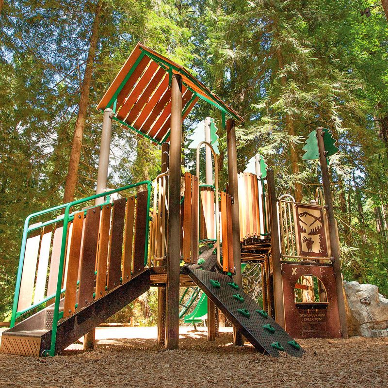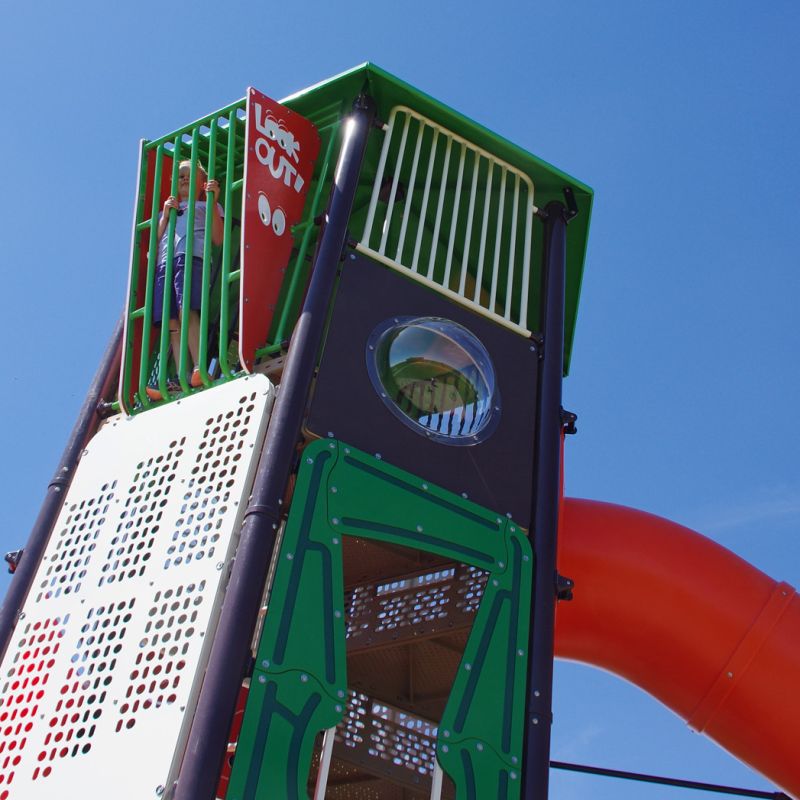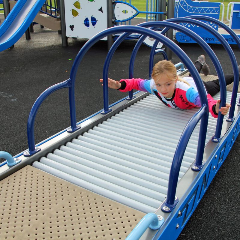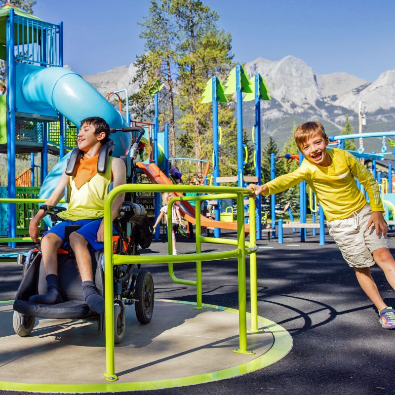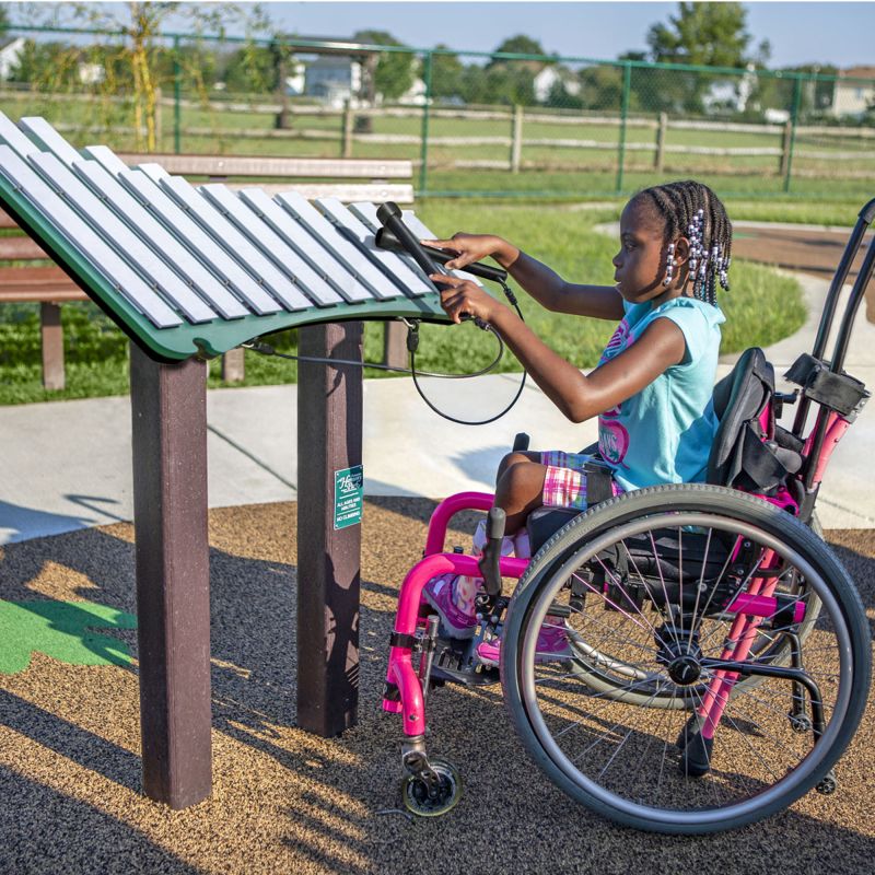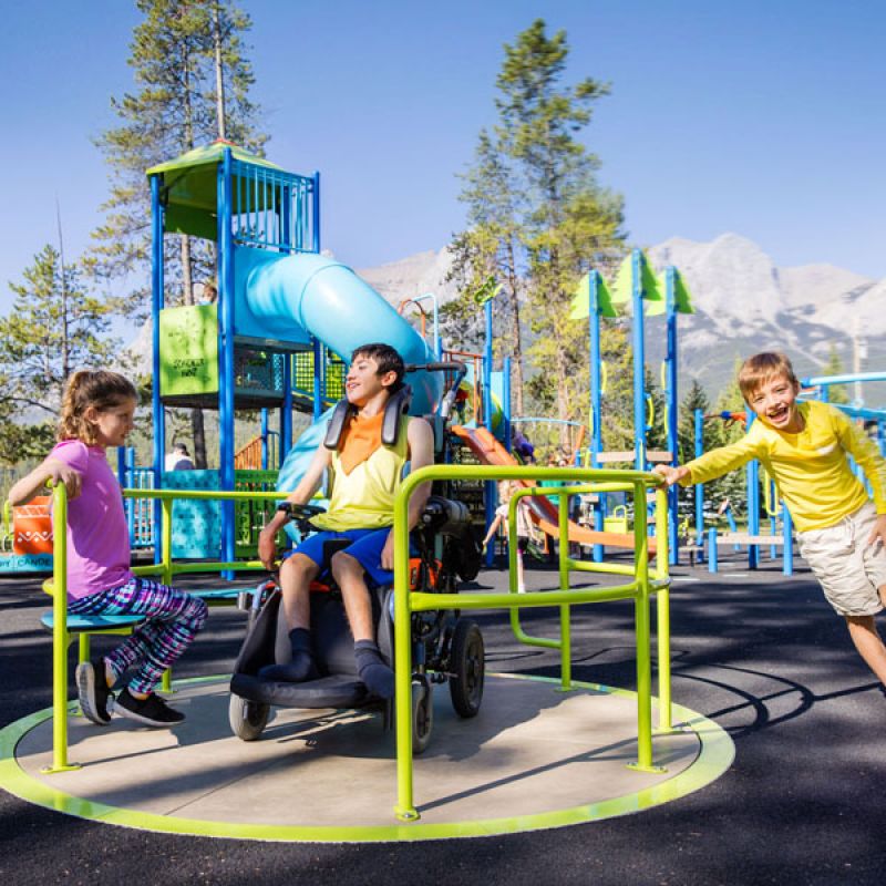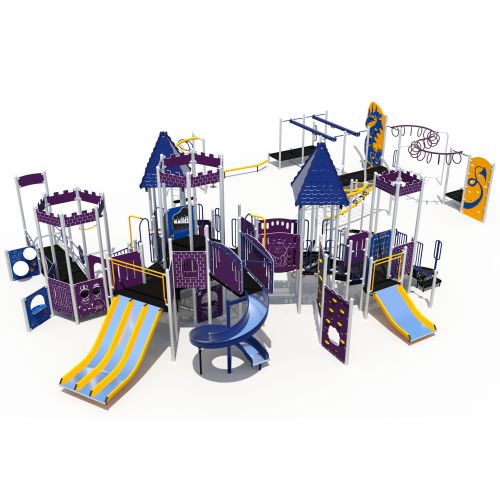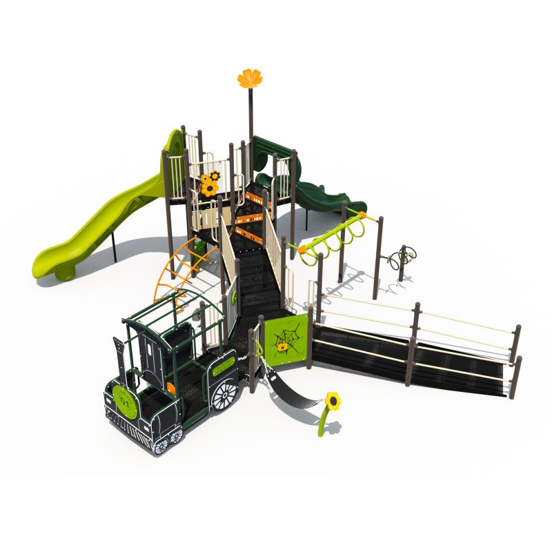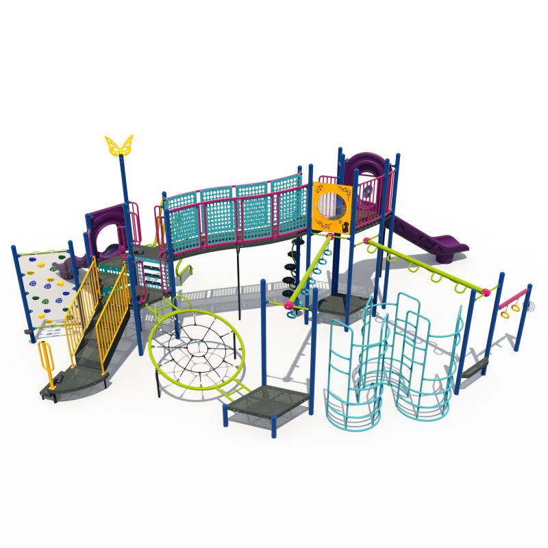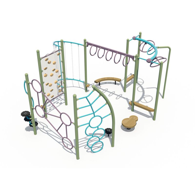 - accessible with appropriate design & surfacing, extensive ramping and multiple ground level activities, wheelchair playable to the top