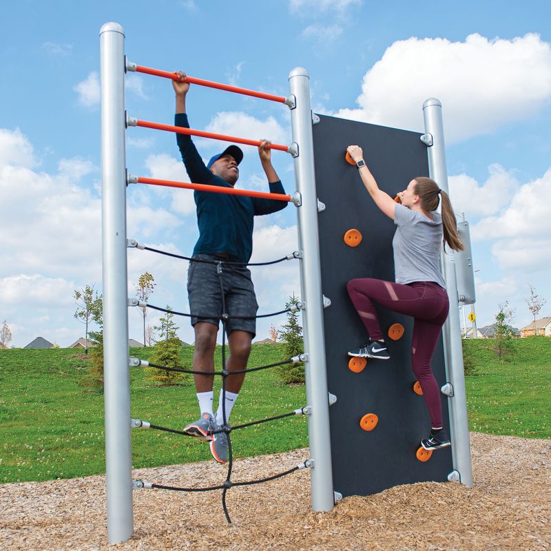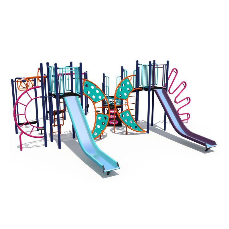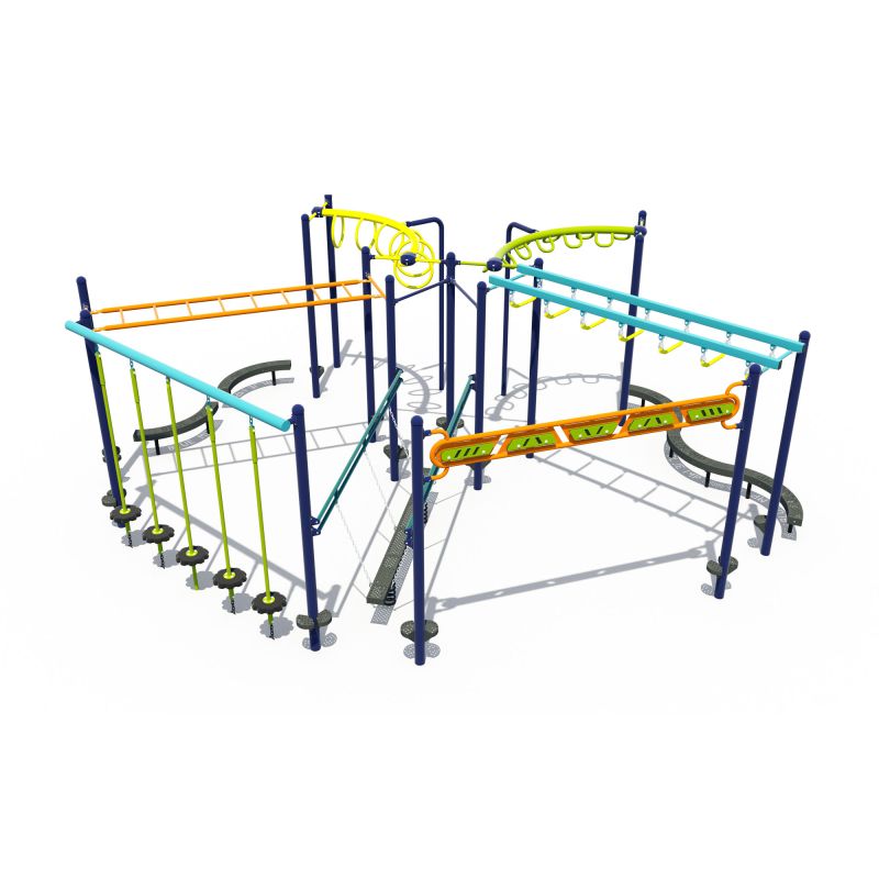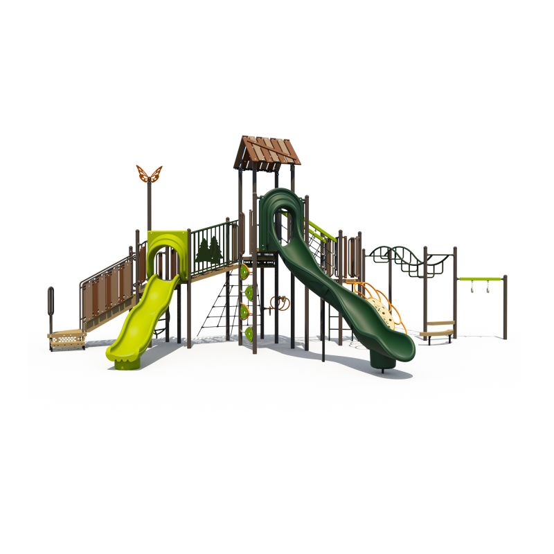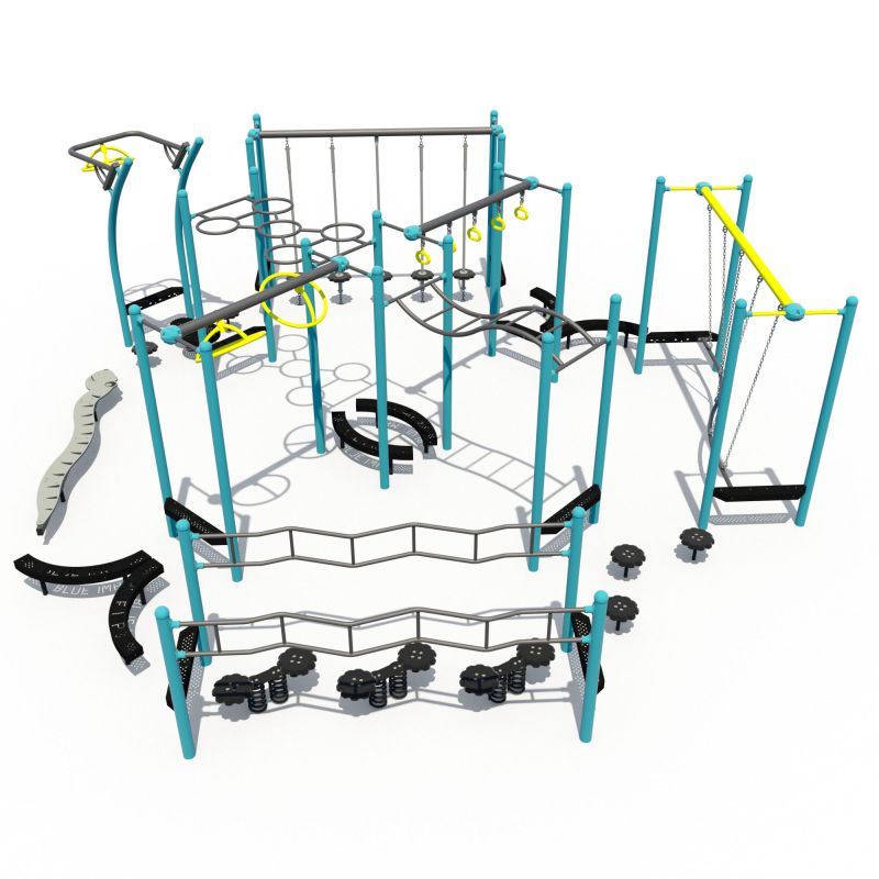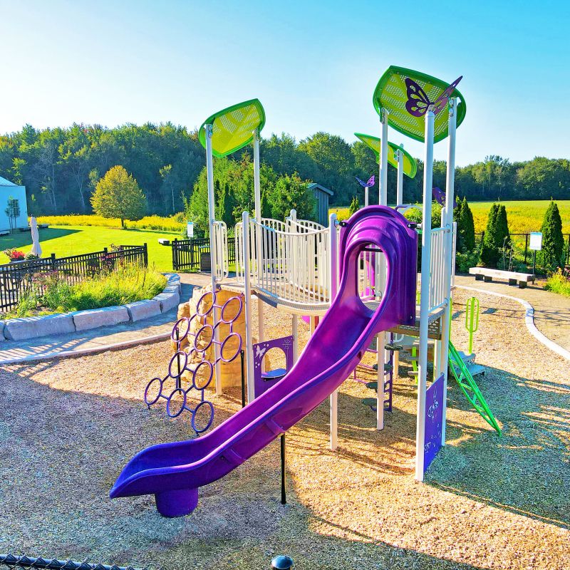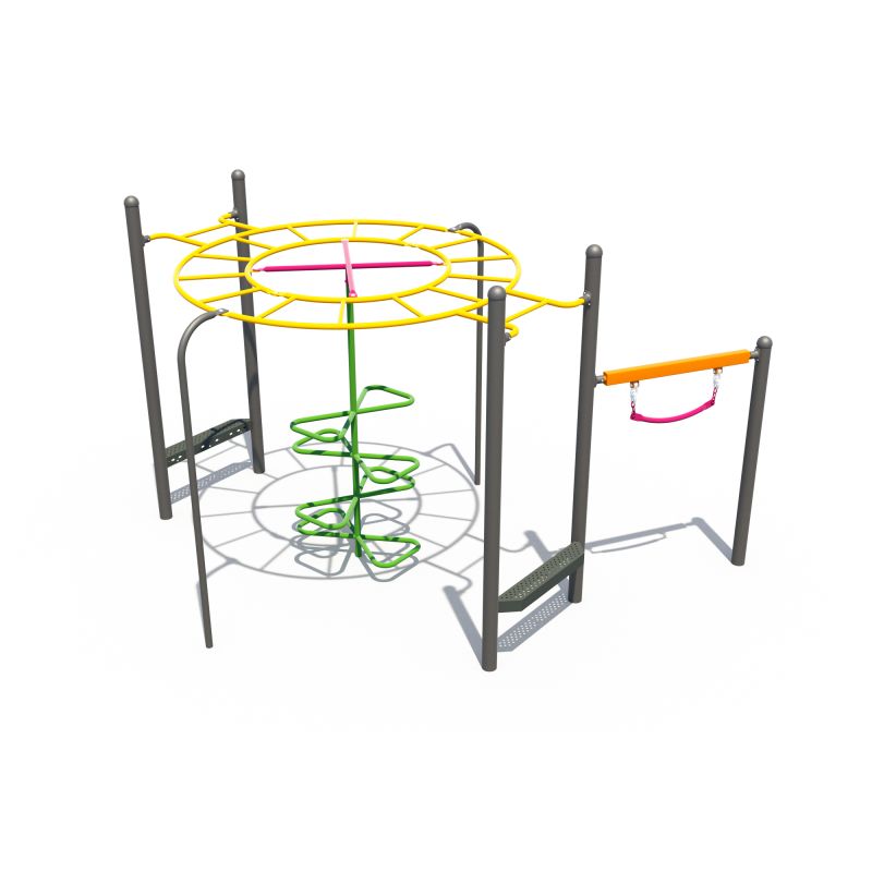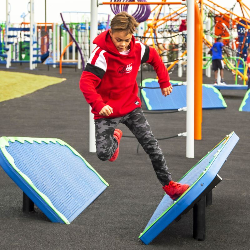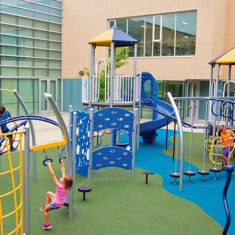 - accessible with appropriate design & surfacing, extensive ramping and multiple ground level activities, wheelchair playable to the top