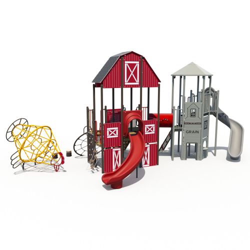 With loads of custom details, the Farmhouse Fun themed playground features a soaring hayloft complete with climbing and sliding adventures plus a multi-user bouncing tractor. Kids can make their way up the climber of their choice before zooming down one of the slides or bouncing their way over the fields on the tractor. A great way to promote both active and imaginative play for young wanna-be farmers.