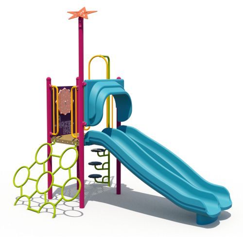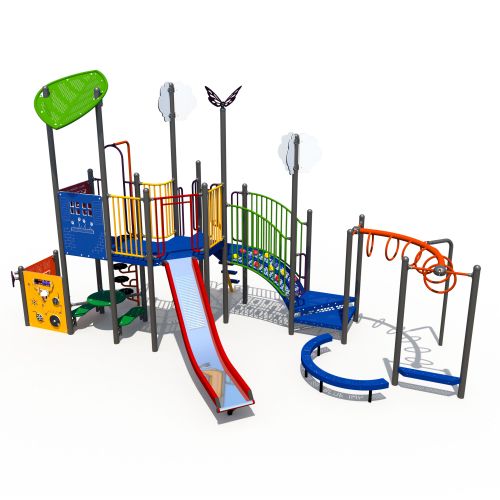 The Funoodles pre-school playground structure supplies oodles of fun for little ones aged 2 to 5. This compact design features climbing, sliding and sensory play as well as upper body activity. Ground level play elements along with a transfer station ensure that this design meets Annex H requirements.