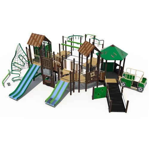 Little campers will scramble up the Boulder or Treehouse Climb before zipping down one of the slides on the Goldstream nature-inspired playground. Wood-look slats create the feel of a treehouse or fort.