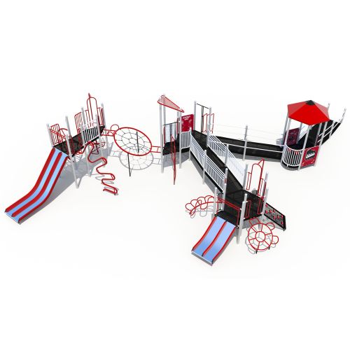 The Intrepid inclusive playground combines wheelchair ramps with low-profile, accessible stairs to create easy access for varied abilities. Climbers, slides and an upper-body circuit round out the play. This structure is Annex H compliant.