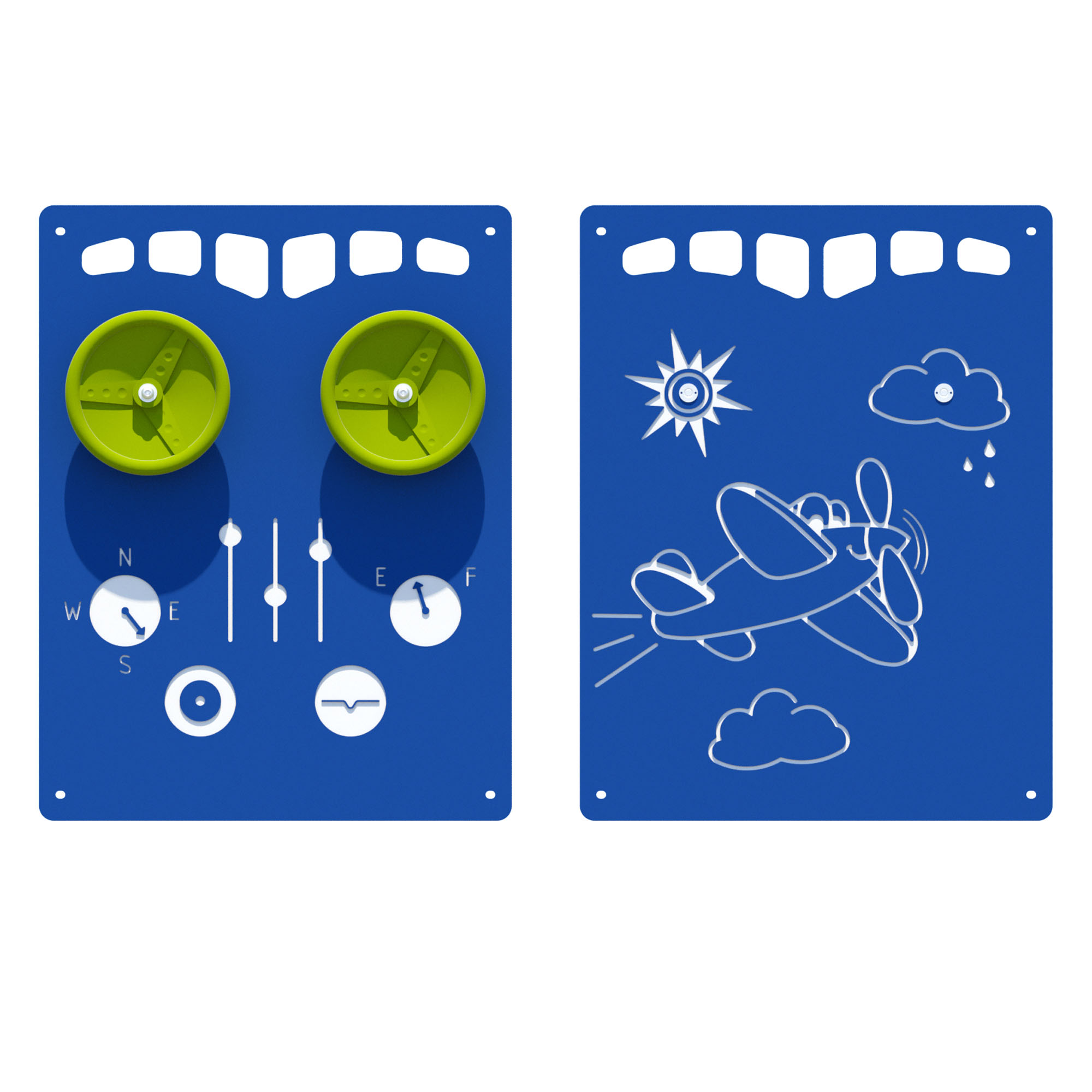 The Pilot Panel playground panel lets a pilot and co-pilot take flight together, steering their imaginations wherever they want to go. Featuring two side-by-side steering wheels and airplane-themed graphics on both sides, this interactive panel encourages parallel play, cooperative storytelling and role-playing fun.