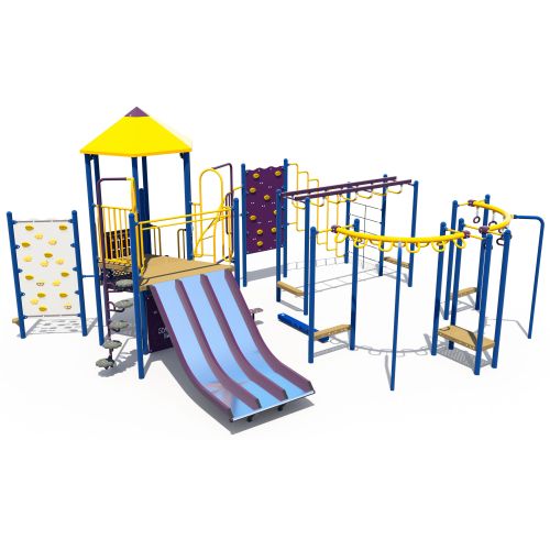 Achieve the ideal communithy park or school play structure with the Pipestone playground design. Boasting a compact footprint, this design features a diversity of sliding and climbing fun, along with ground level activities.