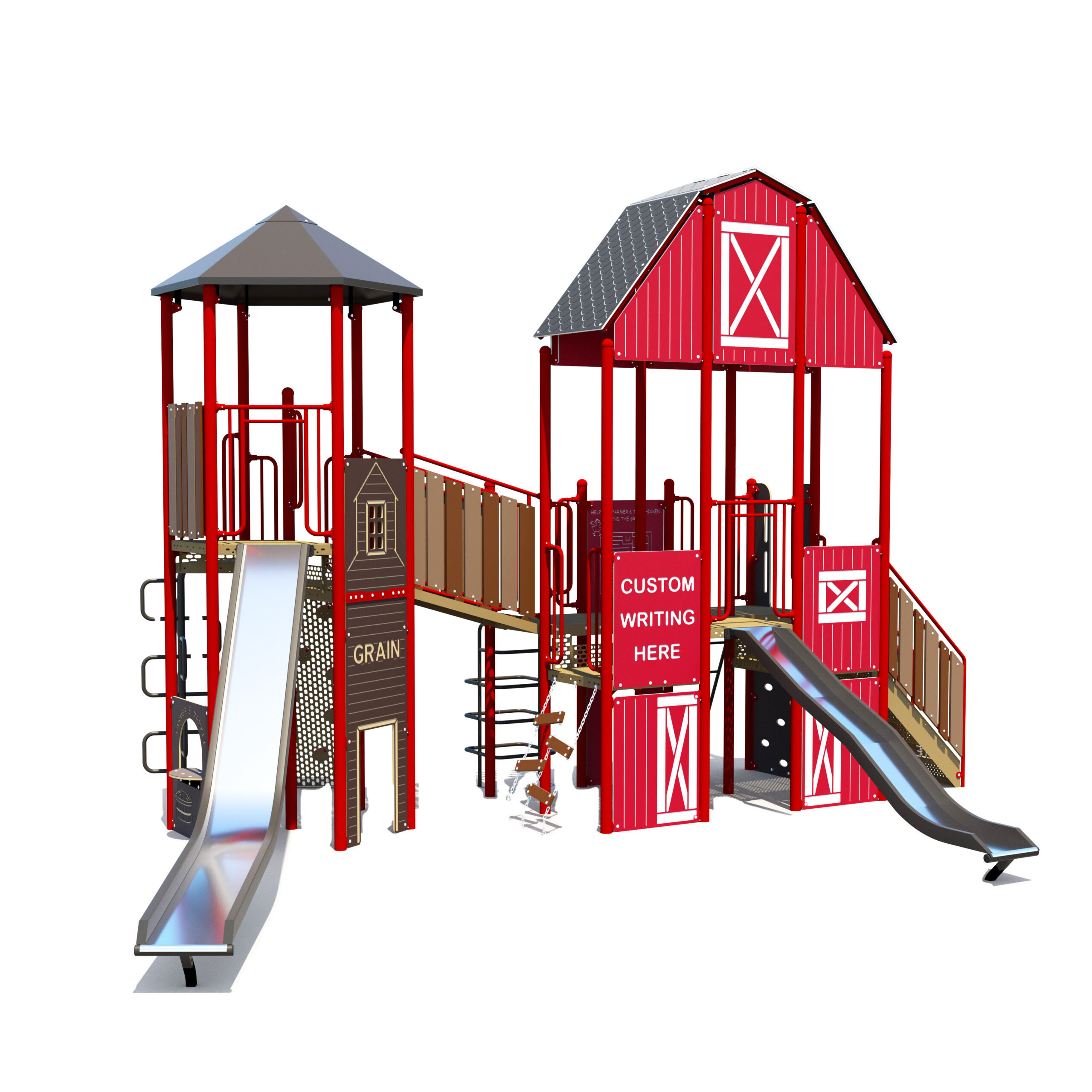 Create an imaginative play space with the Playful Acres farm-themed playground. With its classic red barn and grain elevator and loads of farm-themed details, this fun-filled design will appeal to country and city dwellers alike.