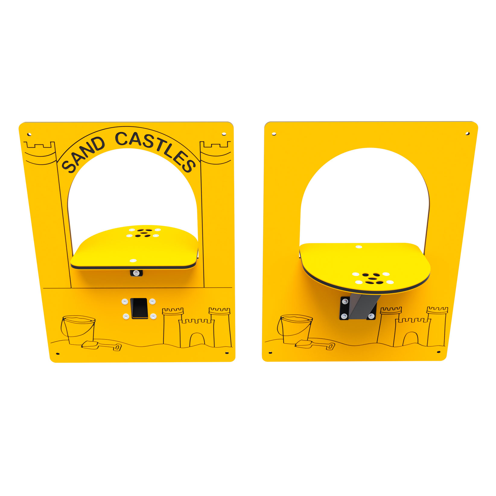 The Sand Castle play panel invites users to send sand or gravel through the chute for their friend on the other side to try and catch. Provides calming, sensory play at the playground. A great option for playgrounds that feature sand or gravel surfacing.