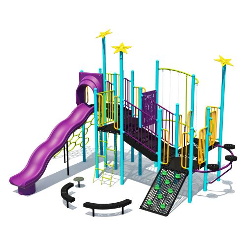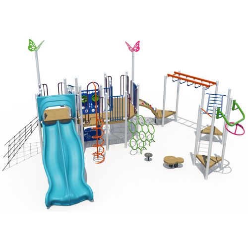 Take play to new heights with the Sky-Play tower playground, part of our Sky-Play Series! With a total height of more than 23′, Sky-Play 1 features thrilling slide descents from heights of 14′ and 12′ plus loads of fun on the way up. Young adventurers will love leaning out and peering down from Lookout Point at over 14′. Great impact and play value in a small footprint!
