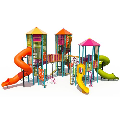 The Skywalker tower playground brings together our Rootz Series and SkyPlay Series to create a unique, nature-inspired double tower design! Features dual towers and our Lookout Point plus two twisty tube slides,all connected by the Evergreen Arch Bridge. A variety of play elements at ground level and loads of fun all the way up make the Skywalker a must-have for your next playground project.
