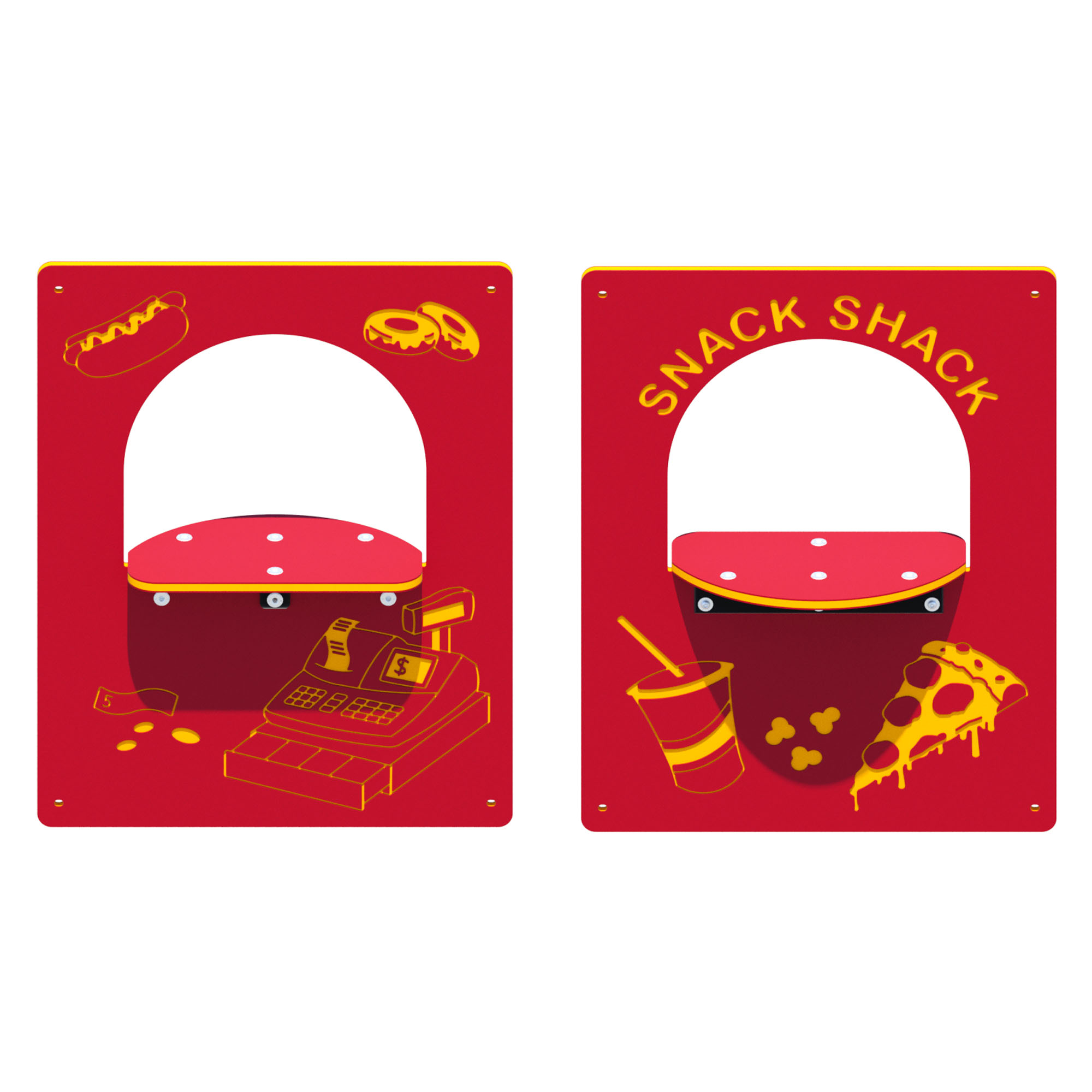 The Snack Shack playground panel invites kids to step up to the counter and serve up imaginary snacks and treats through its open service window. Featuring playful snack-themed graphics, this interactive panel encourages social interaction, role-playing and cooperative fun.