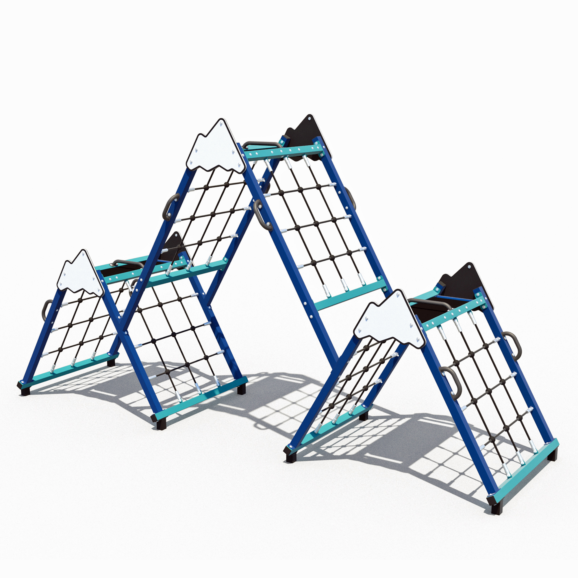 With its three showy snow-capped peaks, the Triple Peak Climber climber makes a bold visual statement and entices kids to explore. Angled nets at various heights invite young adventurers to climb, clamber, hang or even perch atop the peaks. The Triple Peak creates physical challenge and fun for diverse ages and skill levels, challenging kids to test their strength and coordination as they navigate their way up, down, over or under this unique playground climber. Children who are unable to climb can still feel they are a part of the action as they make their way through the structure or try pulling themselves up on the rope from underneath.