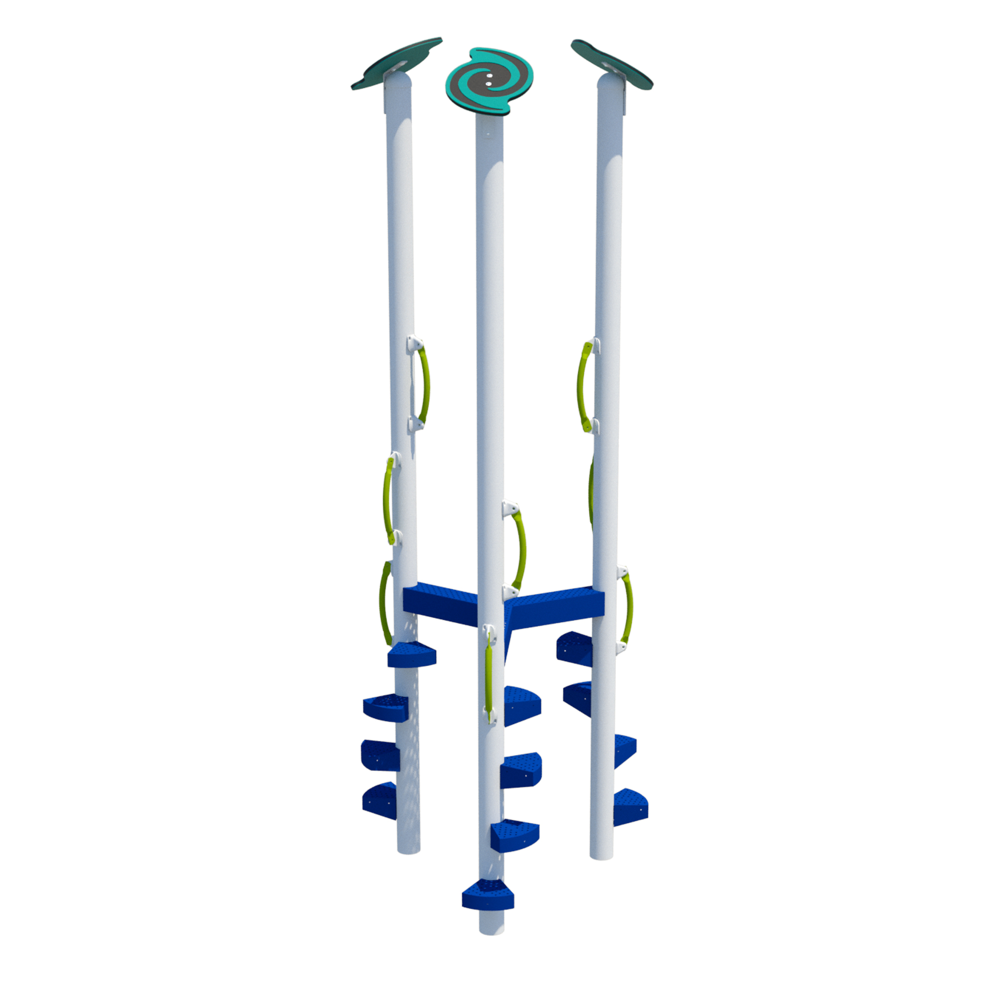 The Triple Swirl Climber is a trio of vertical playground climbers. Creates variety of climbing and clambering challenges as kids navigate up, down and across. Engages diverse muscle groups and motor planning.