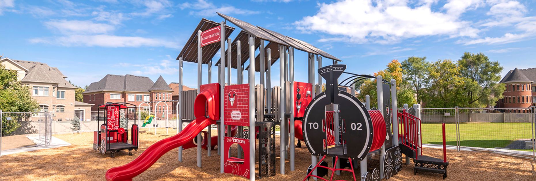 All aboard for adventure! This train-themed playground was thoughtfully designed to reflect the cultural heritage of King Station which operated from 1853 to 1967 and was the first stop on the way from Toronto to Lake Simcoe on the Canadian National Northern Railway line. Considered the oldest surviving railway station in Canada, the station has had an interesting journey of its own. Visitors can now enjoy touring the museum and historic building as well as spending time at the fully customized train-themed playground. At the heart of the playground lies a charming train station complete with a ticket window, where children can role-play as conductors, passengers, or ticket agents. The realistic locomotive and train cars invite kids to climb aboard and explore, inspiring endless make-believe adventures on the rails. The playground is designed for a variety of play styles, blending exciting physical activities with engaging sensory and imaginative elements. For younger adventurers, there are low-to-the-ground components and toddler-friendly activities, ensuring fun for all ages. The vibrant color scheme and train-themed details create an immersive environment that captivates children and parents alike. Custom details throughout tie in to the heritage and history of King Station. Whether kids are embarking on a pretend journey across the country or mastering the playground’s physical challenges, this train-themed playground delivers smiles at every stop!