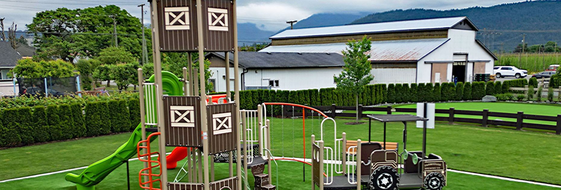 Nothing is more rewarding that creating custom designs for one-of-a-kind customers. Looking for a unique experinece and wanting to tap into the history of the property, Farmhouse Brewing Co. in Chilliwack, B.C. reached out to us for ideas on creating a farm-themed design that could match their vision and become a destination for their customers. They wanted to pay homage to the historic farming history of the property and the Chilliwack area so Farmhouse was looking for a unique design that would complement the setting but also stand out and provide a fun challenge for users. We were able to incorporate their logo into a bouncing tractor as well as on the barn panels that stand out and attract passersby to visit the brewery. The colour palette was chosen to match the existing buildings along with the turf surfacing to match the surrounding grass as well as the existing golf putting green. After considering various options and designs, the final design really captured the feel of what Farmhouse Brewing was after. They now have created a perfect place to relax with friends and family where the children can play on the playground or the putting green all while the parents can unwind and sample locally-crafted brews and wood-fired pizzas.