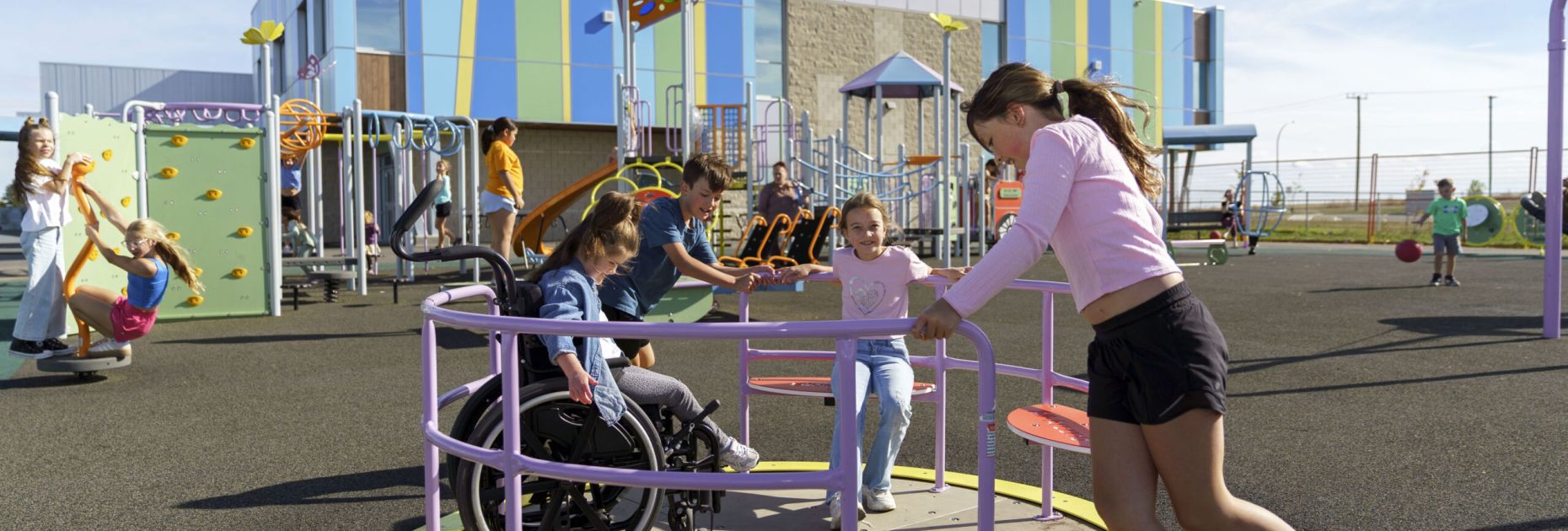 This vibrant new inclusive playground was thoughtfully designed for a brand new school, inviting children of all abilities to explore and connect. Designed to engage a diversity of ages, stages and abilities, this inclusive play space boasts numerous accessible activities along with a large classic play structure featuring exciting climbers and overheads plus our ultra-durable, stainless steel slides (static-free and safe for users with cochlear implants). A rich variety of ground-level activities—including a fully accessible merry-go-round, inclusive multi-user rocker, multiple swings including accessible swing seats, interactive play panels, and a calm zone for quieter play—ensure that every child can enjoy meaningful play experiences. Bright, school-inspired colors make the space feel welcoming and lively, while soft rubber surfacing and accessible pathways from the sidewalks make everything accessible and easy to reach.