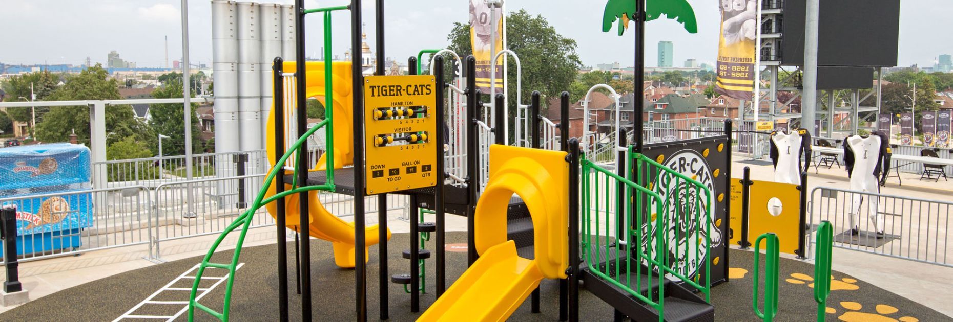 Putting a brand into play (literally!) for the youngest Ti-Cat football fans was the objective for this unique project — a Canadian first! The Hamilton Tigercats chose Blue Imp to create a fully-branded play structure for their stadium and their youngest fans. From the logo-emblazoned climbing wall to the post-toppers, surfacing designs and colour scheme, our design team came up with fun solutions to work Ti-Cat details into every aspect of this compact play structure. A variety of ground level activities, along with a transfer station and pour-in-place surfacing, make the fun accessible for diverse ages and abilities. The end result is a winning mix of corporate branding and entertainment for kids. A great example of Blue Imp’s ability to customize your playground design!