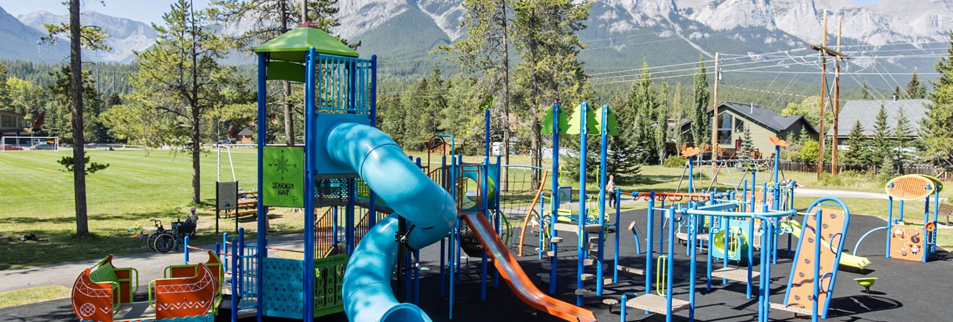This vibrant, inclusive playground has the honour of being Canmore Alberta’s first fully inclusive play space! The playground was designed with valuable input from Rocky Mountain Adaptive to ensure that the design delivered the best possible options, allowing all children to play together and enjoy a rich range of physical, sensory and social experiences. The play space that goes beyond accessibility to create play experiences that meet a variety of needs and interests, enabling children of all ages, stages and abilities — as well as their caregivers — to interact with each other and do what everyone wants to do: PLAY!