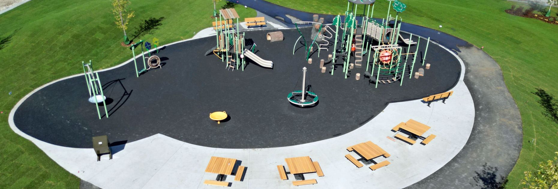 The new community of Aspen Woods wanted a nature-inspired playscape that suited the identity of the neighbourhood. This woodsy and whimsical playscape invites exploration on a huge diversity of play elements, both ground-level and elevated. Bolder adventurers can conquer the challenging climbing course, complete with a lifelike Oak tree climber, log tunnel, and rope spinner, while the little ones enjoy their own miniature swaying swing, climbers, and slide in a dedicated toddler structure. With a saucer swing, woodland cafe, and musical flowers, this foresty retreat offers an unforgettable play experience for all ages and stages!