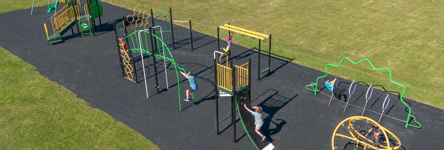 This project is a great example of responding to the unique needs of the customer. New Liskeard Public School, a JK to Grade 6 school in northeast Ontario, was seeking an engaging playground that catered to the complete range of ages and skill levels, separating the play between the younger and older age groups while keeping all the equipment in the same space. We addressed these needs by designing a challenging Blue-Kour obstacle course for the older ages, along with a swings set and a smaller play structure geared toward younger ages, all installed on poured-in-place rubber surfacing. The obstacle course features our the Ninja Wall, Dino Loop along with other challenging play elements demanding strength, agility, balance and motor planning skills. The District School Board Ontario North East is a great customer to work with, always responsive to questions while on site.