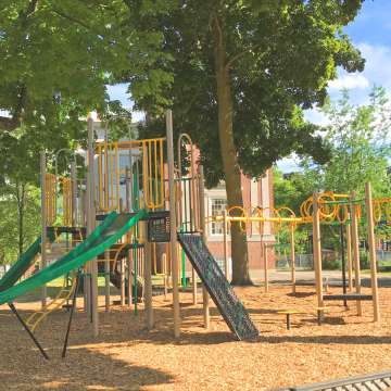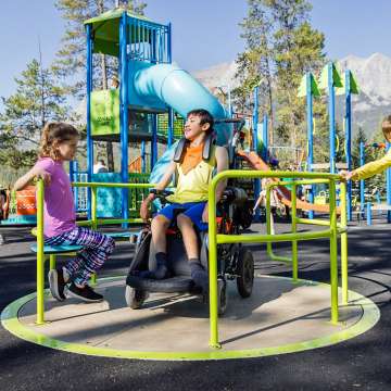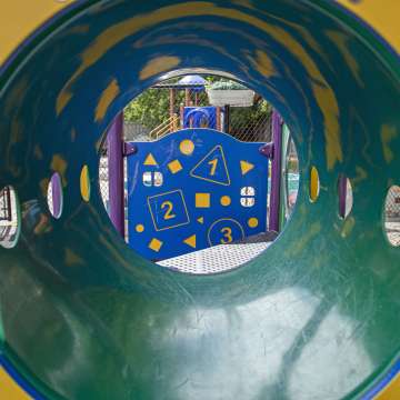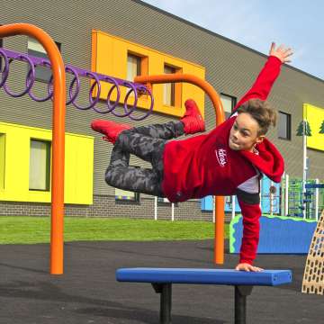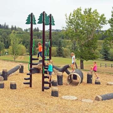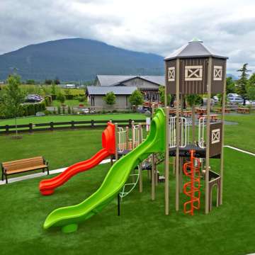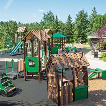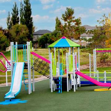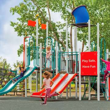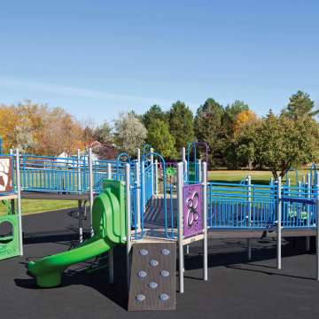 The large, central climbing net is the nucleus of this space themed playground. Loads of clambering, hanging, balancing and sliding activities surround it. Speedy stainless steel slides up to 95″ high provide thrilling descents for thrill-seekers. Lower slides and ground-level play cater to younger children. The Space Station storefront panel and planet toppers complement the space theme. The play space was finished with seamless pour-in-place surfacing scattered with colourful spots for added play value.