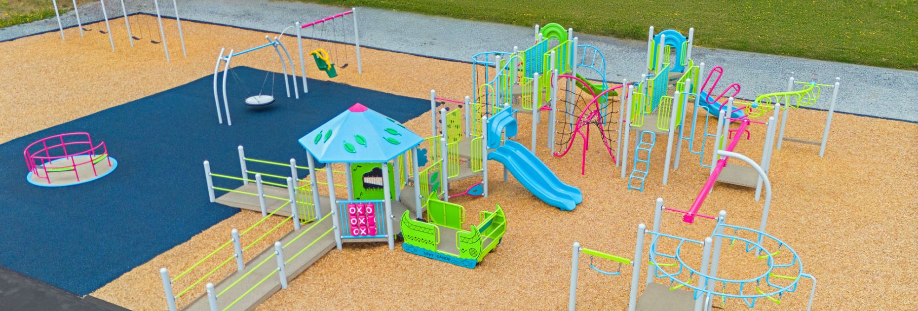 Creating this playground design for Seaforth Elementary School in Burnaby, B.C. was rewarding, as this school had gone several years without any playground equipment. The PAC and School District Administration (along with a famous and wealthy neighbour whose children attend the school), helped make this dream a reality. One of the top goals for the school was to make the playground as inclusive as possible. We came up with an large wheelchair-accessible design featuring two wheelchair ramps, the Accessible Bouncing Tippy Canoe, four exciting slides, the innovative Earthquake Climb, a 20’ Glide Ride, and many more thrilling components. Also included in the design are two 4-bay swing sets as well as a Hybrid Swing with one belt seat and one accessible seat, offering more accessible items. A top must-have was the universally accessible All-Around Merry-Go-Round which creates barrier-free spinning for everyone! Poured-in-place rubber surfacing under the All-Around, Accessible Swing Seat, and wheelchair ramp increased the inclusiveness of the playground. The vibrant Cotton Candy colour scheme added energy to the final result. This project truly has something for everyone of all ages and abilities and has become a true destination playground for this area.